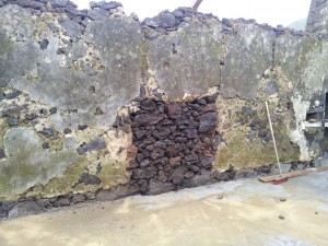 Heute habe ich mir ungefähr 2 qm der Mauer vorgenommen, um ein Gefühl für die Arbeit zu bekommen. Zuerst wird mit Hammer und eventuell Meißel der alte Putz (Lehm) grob entfernt, dann alle Reste mit dem Hochdruckreiniger ausgewaschen, danach alle Hohlräume so gut wie möglich mit Zement gefüllt.